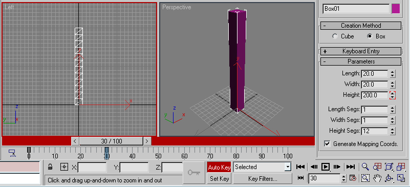 - Go to frame 30 and turn on Auto Key. Increase the box height to 200. Notice that the spinner for the Height parameter now has red lines outlining it; this red indicates that the parameter has animation keyframes applied to it.