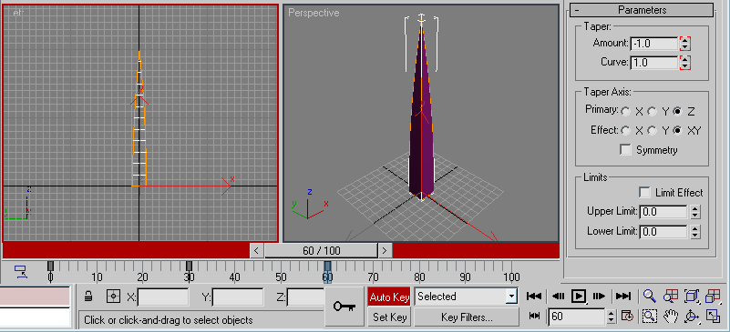 - Go to frame 60 and turn the animate button on. There is a default key for the taper settings already at frame 0, so we will now set new keyframes at frame 60 for the taper modifier.