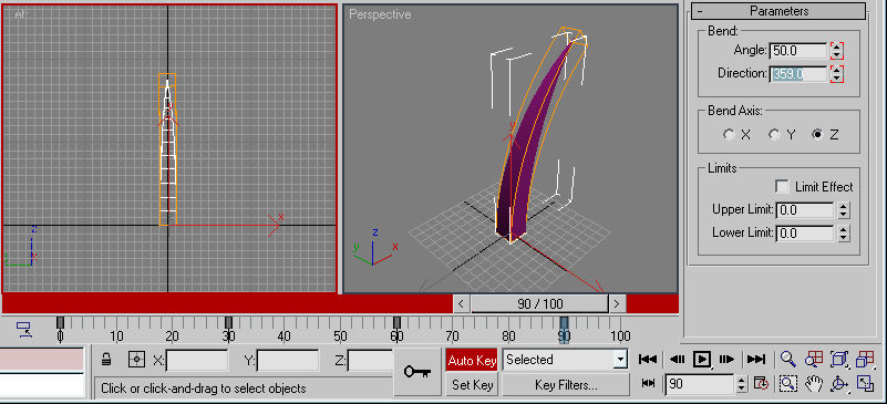 - Go to frame 90, turn the Auto Key button on again, and set the Bend Modifier Angle to 50 degrees and the direction to 359 degrees.