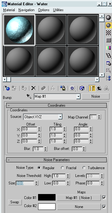 - Assign a map type of Noise as the bump map. Noise is a random pattern generated by Max and has many uses.