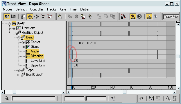 - Preview the animation by dragging the timeslider and notice that the box now begins to bend as it grows and tapers. This is not the exact movement we are looking for. What we want to achieve is to have the box grow, taper and then begin to bend after the other two modifiers have finished affecting the object. Track View offers us an easy way to do this by moving the keyframes that have been set for the bend modifier.