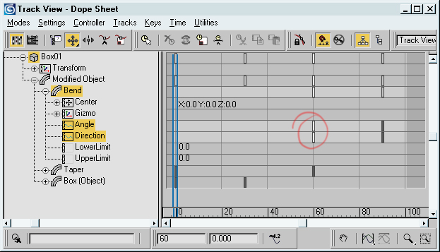 - The box doesn't actually move from the spot it was created so there are no position keys set for it. Expand the Modified Object Track and it is there you will see the keyframes that have been set for the creation parameters as well as for any modifiers that we have animated. Expand the Bend Modifier track and you will see there are keys set for the Angle and Direction at frame 0 and at frame 90 as well. Simply select both the keyframes for the Bend at frame 0 and drag them to frame 60.